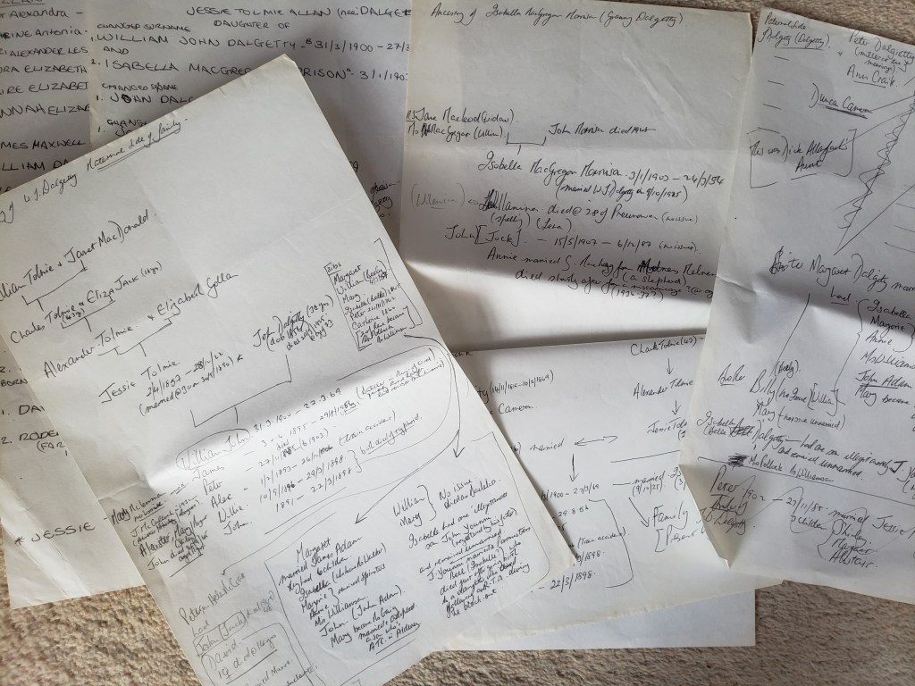 And so my interest was picqued. Who were these people with funny traditions, accents, clothing, food, drink, shared history? I needed to know more! We got home that night and sat round my Granny’s table drawing up a tree. The picture below is it! (My Dad’s handwriting.) I’ve kept it as a reminder and a source of where the info came from. (Already bearing in mind that sources are important!)